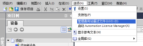 六、如果沒(méi)有安裝過(guò) MCA102 的 GSD 文件,則需點(diǎn)擊‘選項(xiàng)’-‘安裝設(shè)備描述文件’, 操作如圖六所示。若已安裝則直接進(jìn)入第七步。