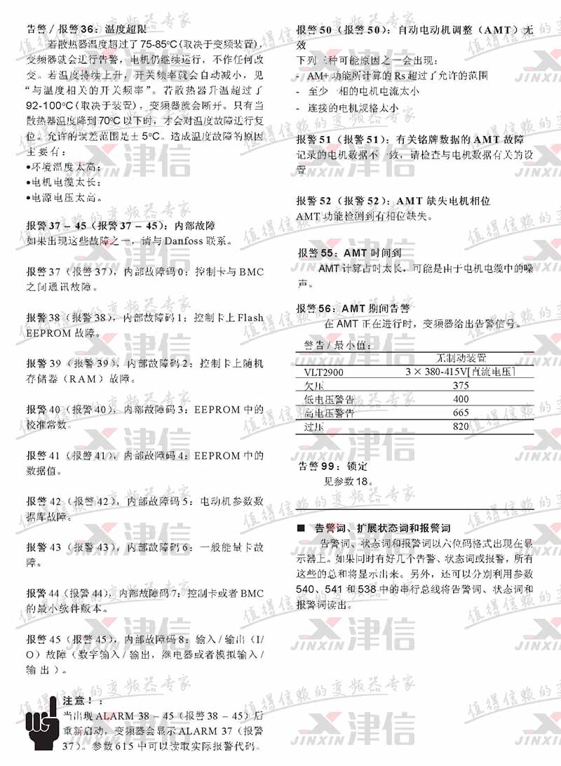 丹佛斯VLT2900變頻器Err36溫度超限,Err37內部故障,Err38,Err39,Err40,Err41,Err42,Err43,Err44,Err45,Err50自動電動機調整無效,Err51AMT故障,Err52,Err55,Err56