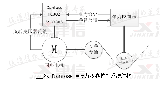 丹佛斯收卷張力控制系統(tǒng)由Danfoss驅(qū)動器(內(nèi)置MCO305運動控制卡)、永磁同步電機和張力檢測控制器構(gòu)成,如上圖2所示。張力檢測控制器根據(jù)卷徑信號和張力傳感器的反饋信號,輸出一個模擬量作為丹佛斯驅(qū)動器的張力參考值,丹佛斯驅(qū)動器負(fù)責(zé)驅(qū)動永磁同步電機,工作在閉環(huán)轉(zhuǎn)矩控制模式下。永磁同步電機轉(zhuǎn)子軸上安裝旋轉(zhuǎn)變壓器作轉(zhuǎn)子角度位置反饋。