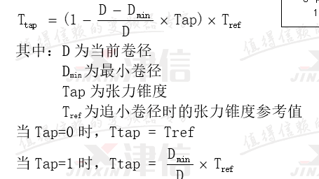 收卷張力錐度控制:有了當(dāng)前卷徑值,和張力錐度設(shè)定值,就能計算當(dāng)前張力。張力與卷徑的關(guān)系如圖3所示,當(dāng)張力錐度為0時,張力保持恒定不變,相當(dāng)于恒張力控制;當(dāng)張力錐度為100%時,卷徑每增大1倍,張力就下降一半,相當(dāng)于恒轉(zhuǎn)矩控制。計算公式如下: