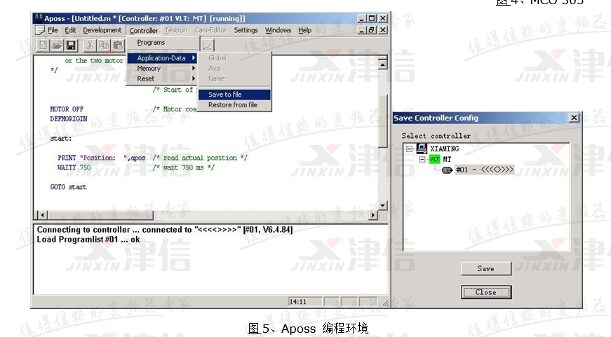 丹佛斯運動控制器使用丹佛斯公司開發(fā)的Aposs運動控制語言,其編程風(fēng)格模仿C語言,并提供多種便利的宏指令,其界面如下圖5所示:
