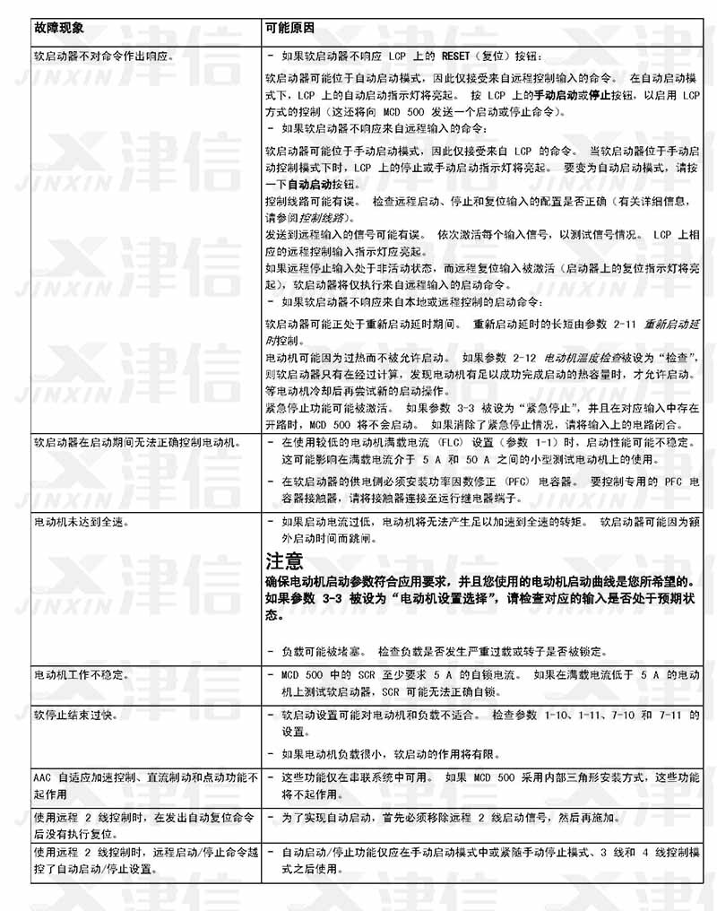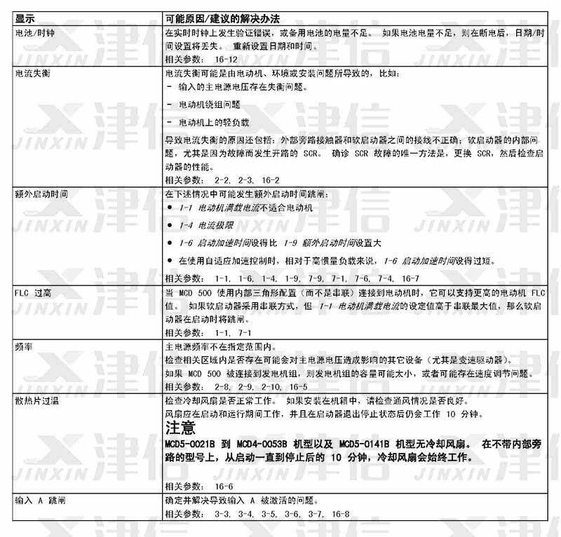 在軟啟動器使用過程中,如果偵測到故障信息,軟啟動器會在日志中記錄相關信息,還可能跳閘或發(fā)出警告。軟啟動器跳閘后,只有將該軟啟動器復位才能重新啟動。 如果發(fā)出警告,則一旦消除了警告原因,軟啟動器便會自動復位。
